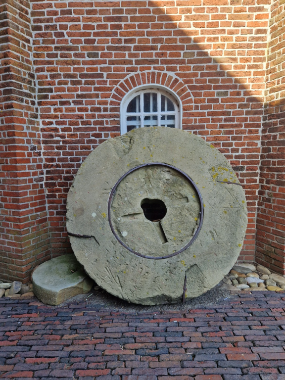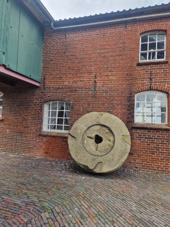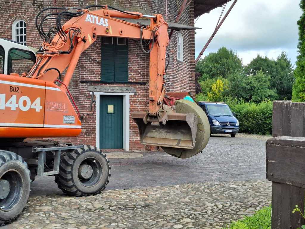 Der Mühlstein wurde mithilfe eines Baggers des Lohnunternehmens Fokke Meyer (vielen Dank dafür!) vorsichtig angehoben und versetzt. Dabei war besondere Sorgfalt geboten, um die Substanz des historischen Steines nicht zu beschädigen. Aktuell steht der Mühlenstein an der Außenmauer unseres gemütlichen Mühlencafé’s und bereichert den Anblick.